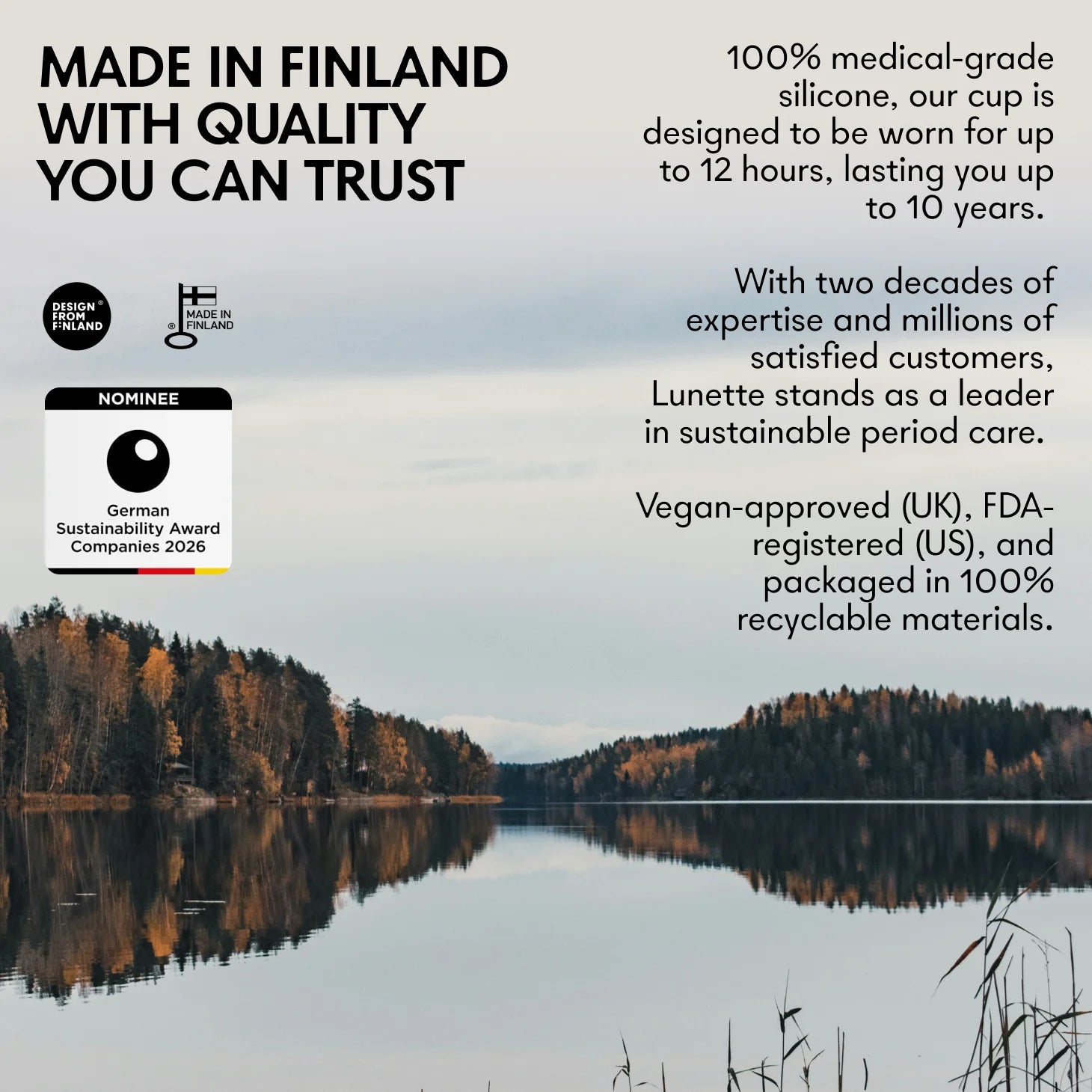 Lunette Period Cups are proudly designed and manufactured in Finland, ensuring exceptional craftsmanship and strict safety standards. Each product carries the Key Flag certification, a prestigious recognition awarded by the Association for Finnish Work.